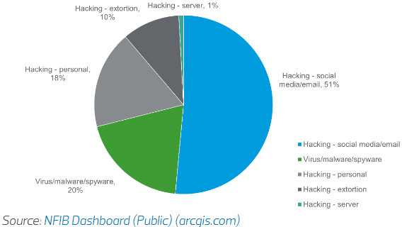 Các báo cáo từ Cục Tình báo Gian lận Quốc gia cho thấy tin tặc chiếm hơn ba phần tư số báo cáo, tiếp theo là virus, phần mềm độc hại và phần mềm gián điệp.